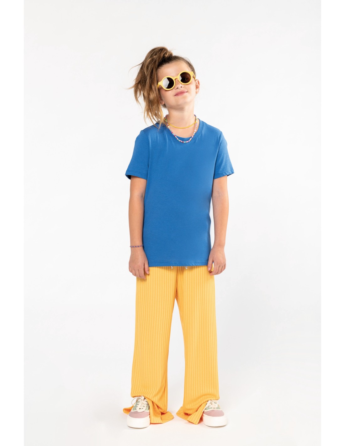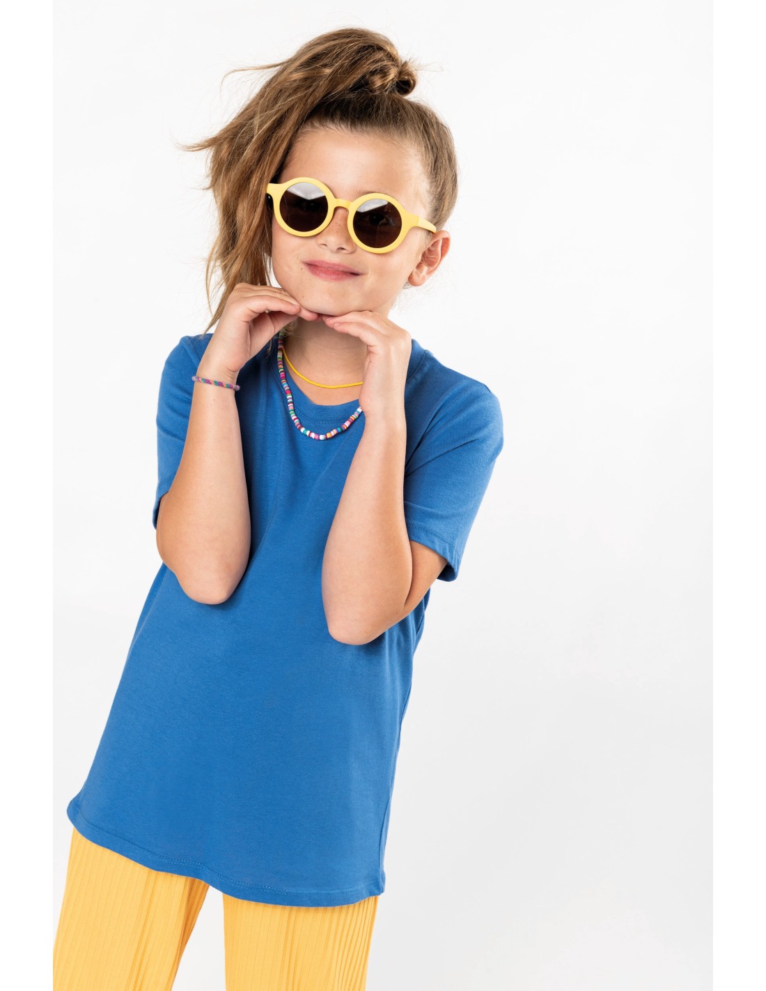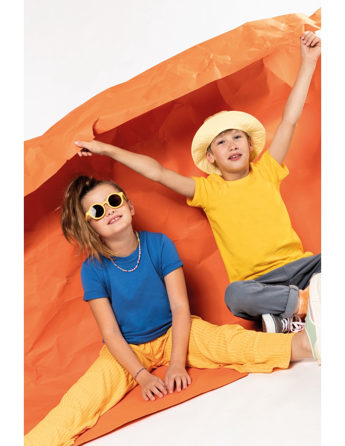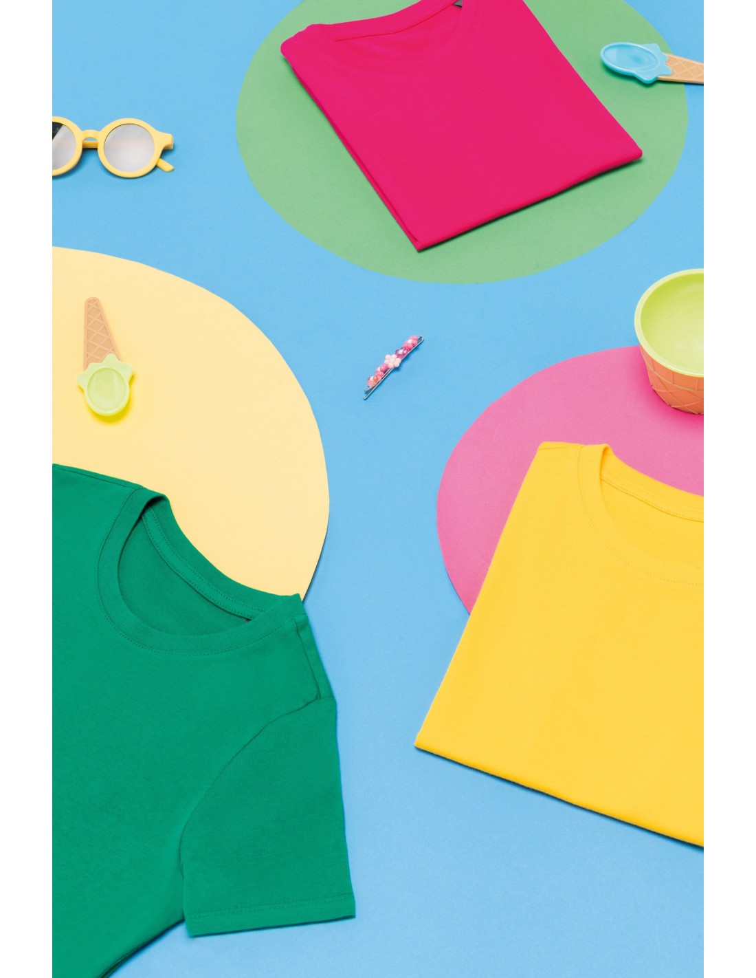 Colores lisos : 100% algodón. Color Ash Heather : 98% algodón / 2% viscosa y Oxford Grey : 90% algodón / 10% viscosa. Todas las combinaciones de colores están hechas de algodón orgánico en conversión. Cortado y cosido. Cuello redondo de canalé y elastano. Tira cubrecosturas a tono en el cuello. Acabado de doble pespunte en el bajo de mangas y de la prenda. Certificado STANDARD 100 by OEKO-TEX®N° CQ1007/7, IFTH.