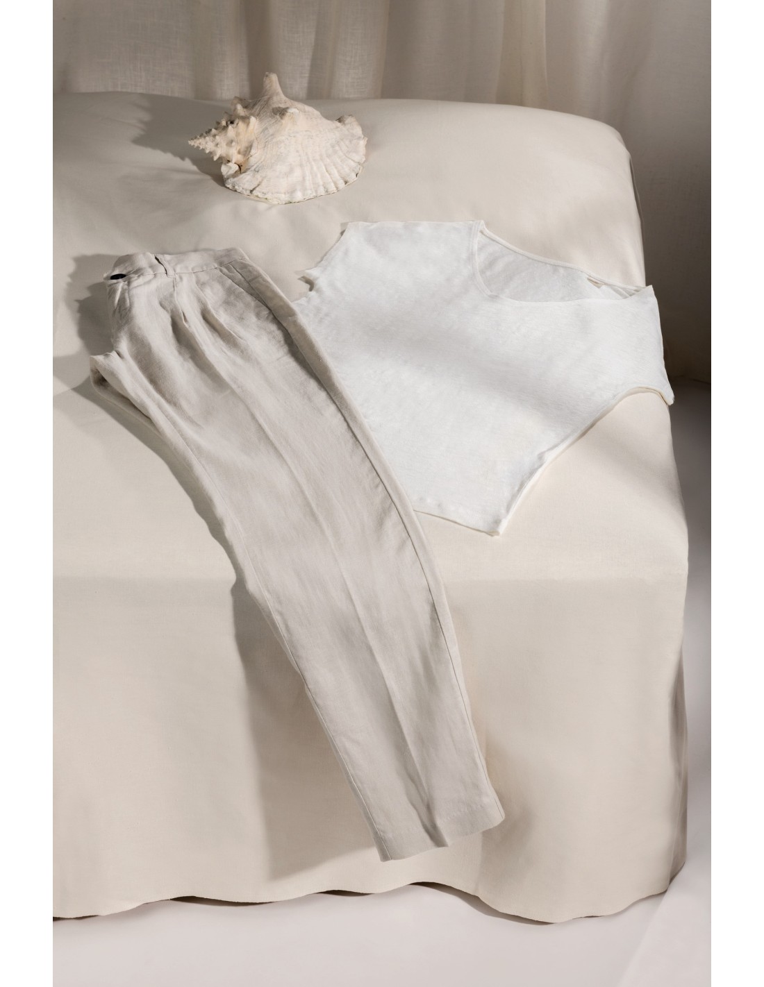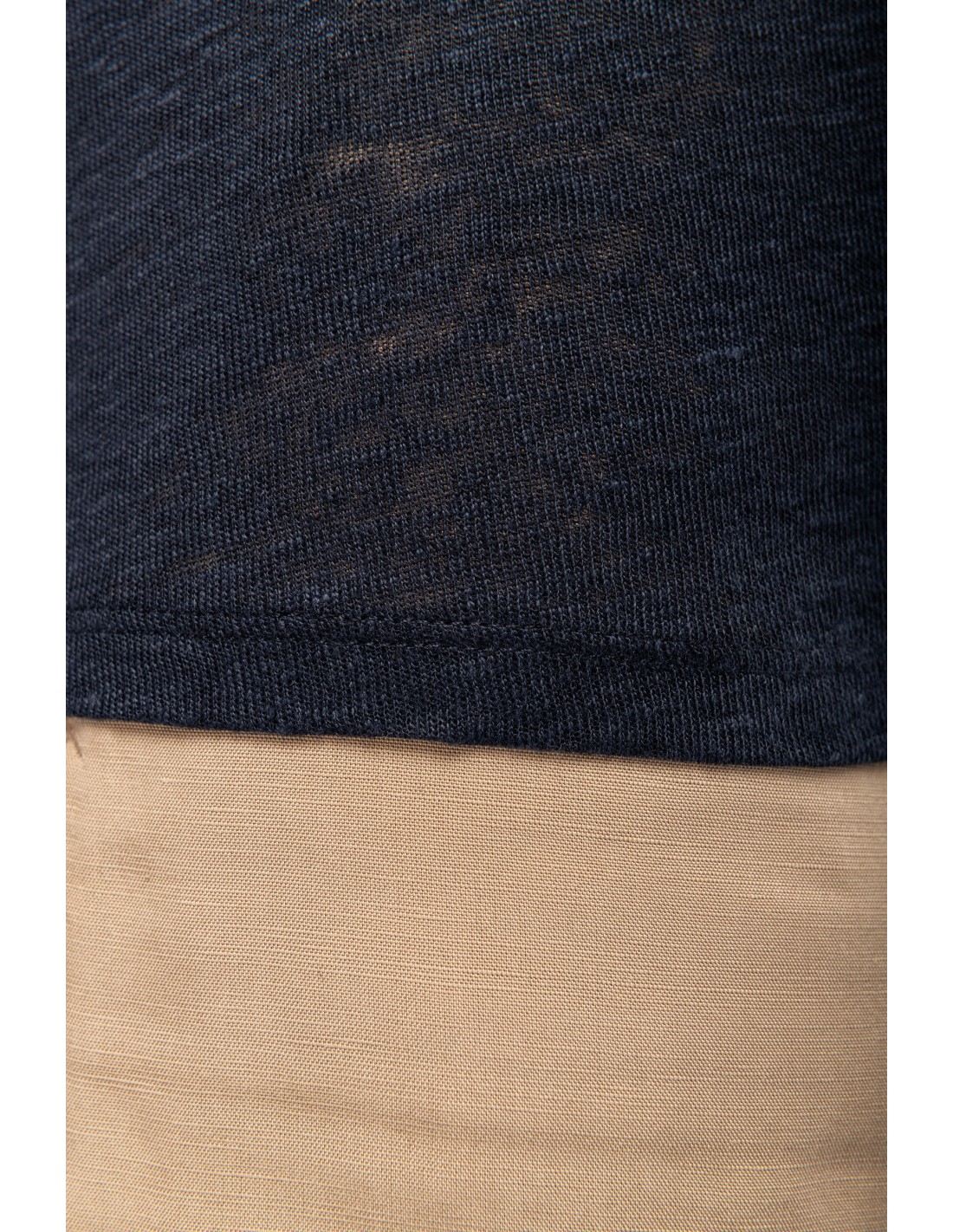 100% lino. Calibre 20. Corte ajustado. Costuras laterales. Cuello de pico en el material principal. Tira cubrecosturas del material principal en la parte interior del cuello. Dobladillo con doble pespunte en el bajo de las mangas y el bajo de la prenda.