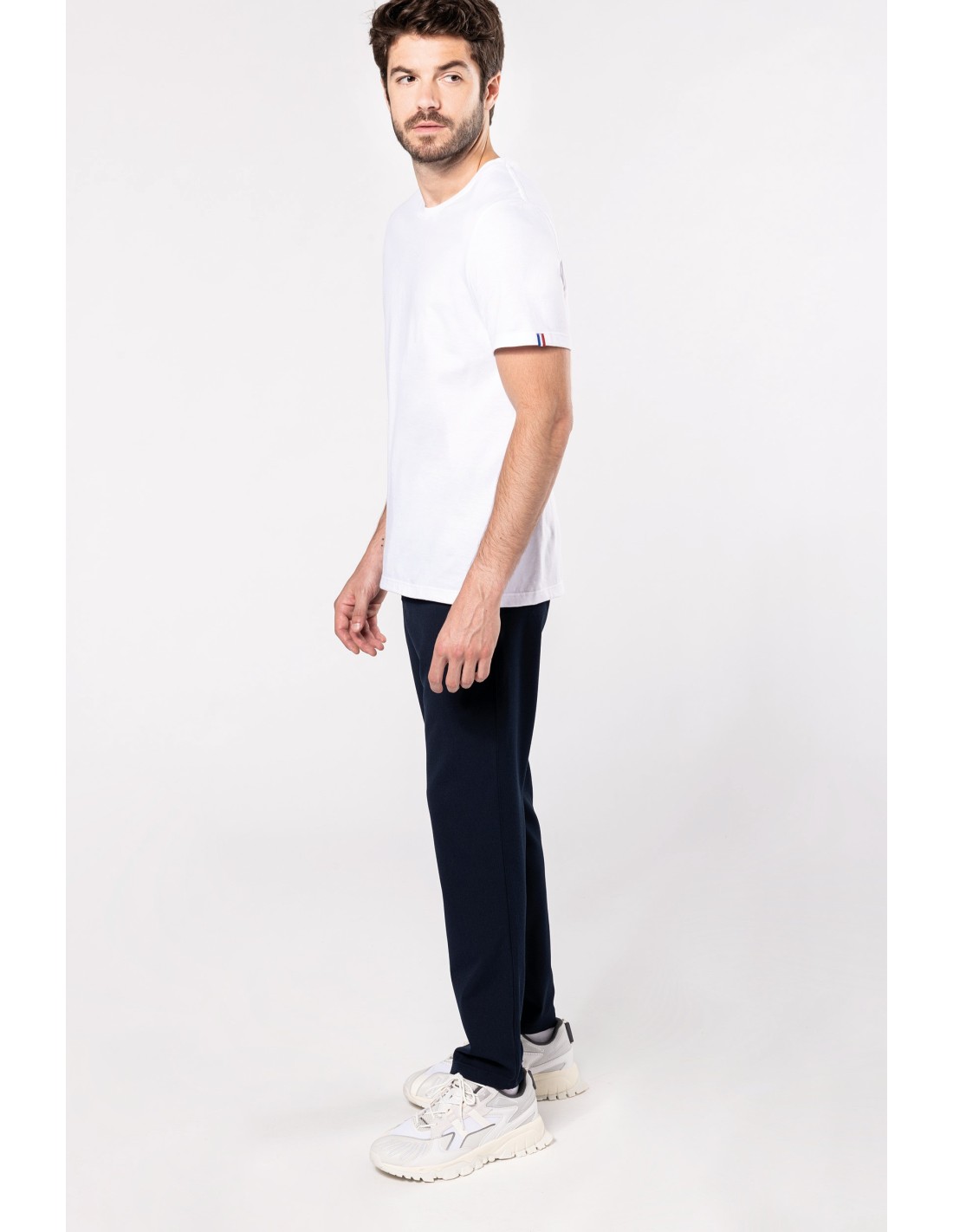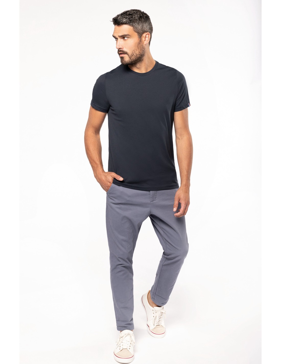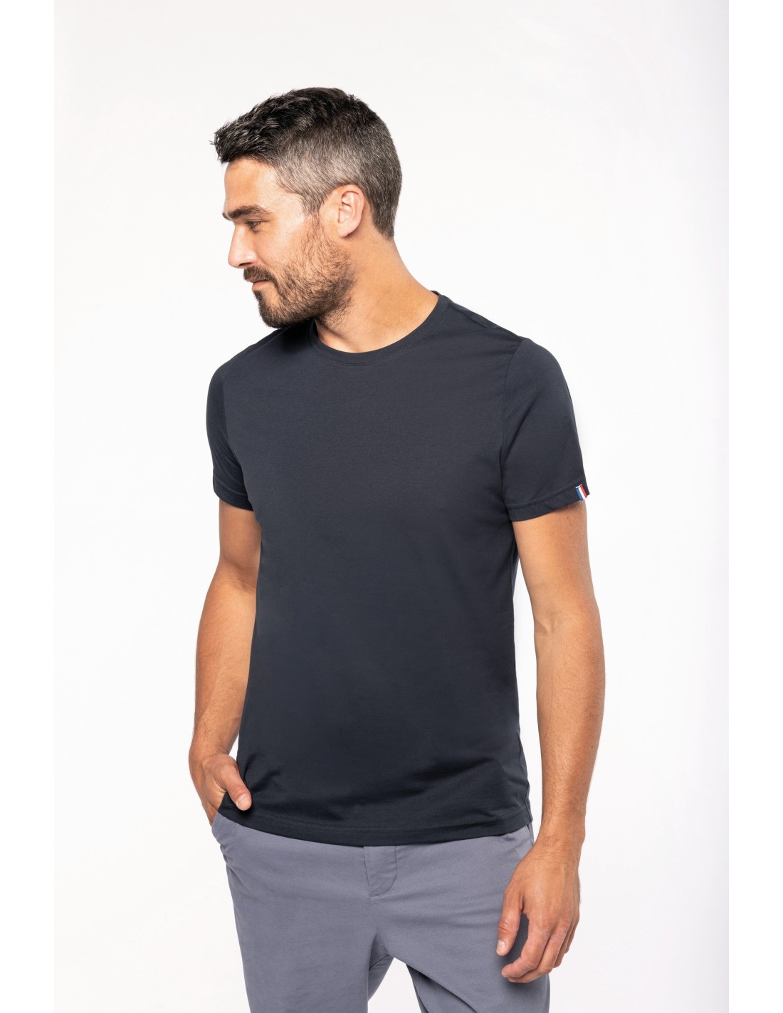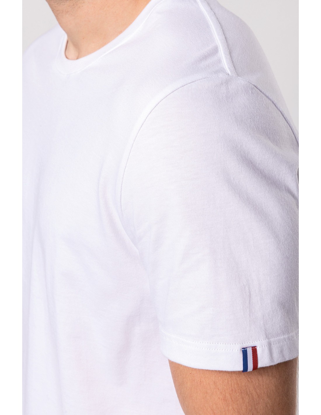 100% algodon orgánico peinado. Etiqueta "Origine France Garantie". Corte y costura. Cuello redondo en canalé. Tira cubrecosturas a tono en cuello y hombros. Etiqueta clip azul / blanco / rojo en bajo de la manga izquierda. Acabado con doble pespunte en bajo de la manga y de la prenda. Embalaje 100% reciclable.