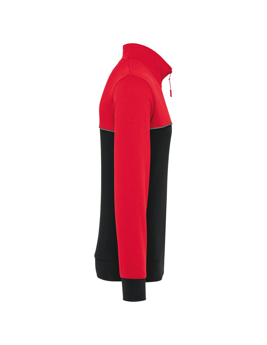 60% cotton / 40% recycled polyester. Brushed 3-yarn fleece with LSF (Low Shrinkage Fleece). Straight fit. Set-in sleeves. Neck with plastic zip and matching recycled zip puller. Contrasting twill taped neck. Half-moon finish at the neckline to facilitate decoration access inside. Contrasting piping between the two-tone parts of the garment (body and sleeves, front and back). 1x1 ribbed cuffs and hem. Elasticated pen holder with 3 compartments on the left sleeve when worn. Tear-away brand label.