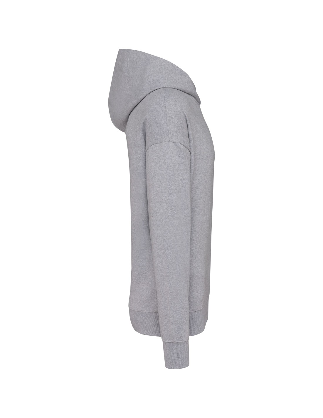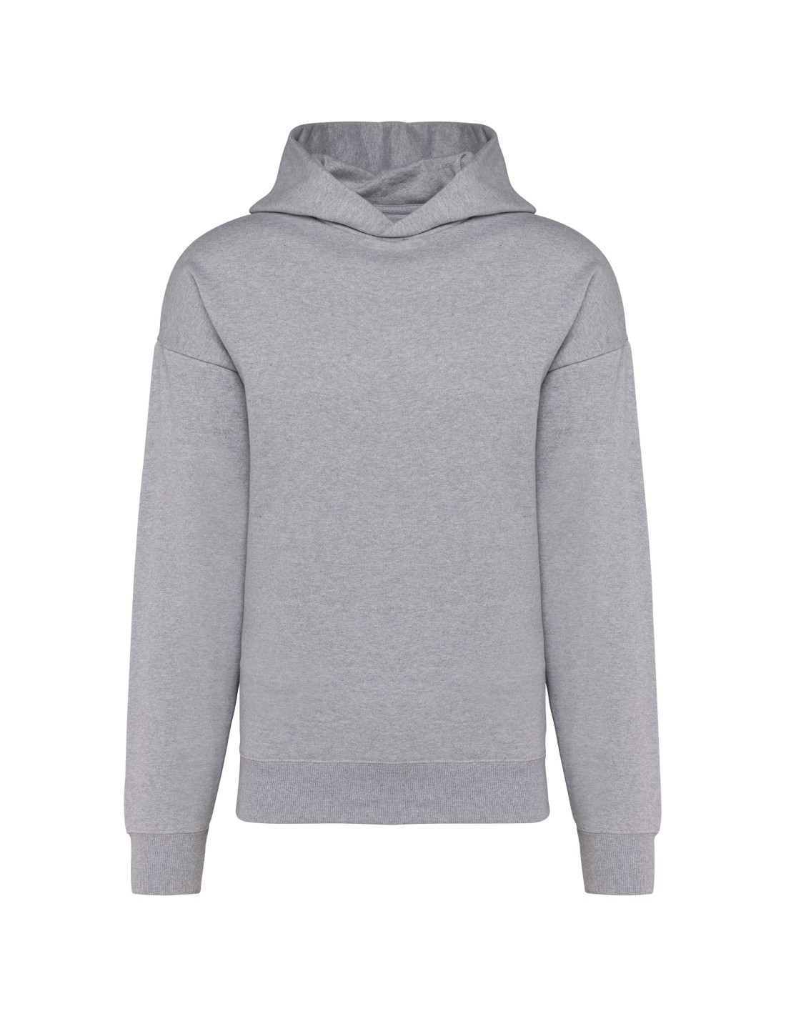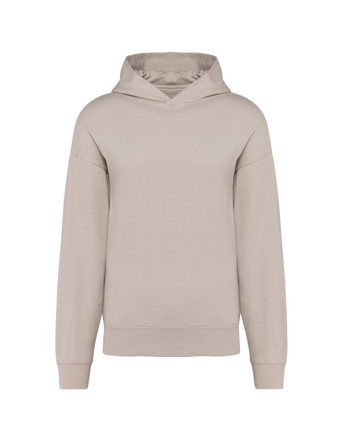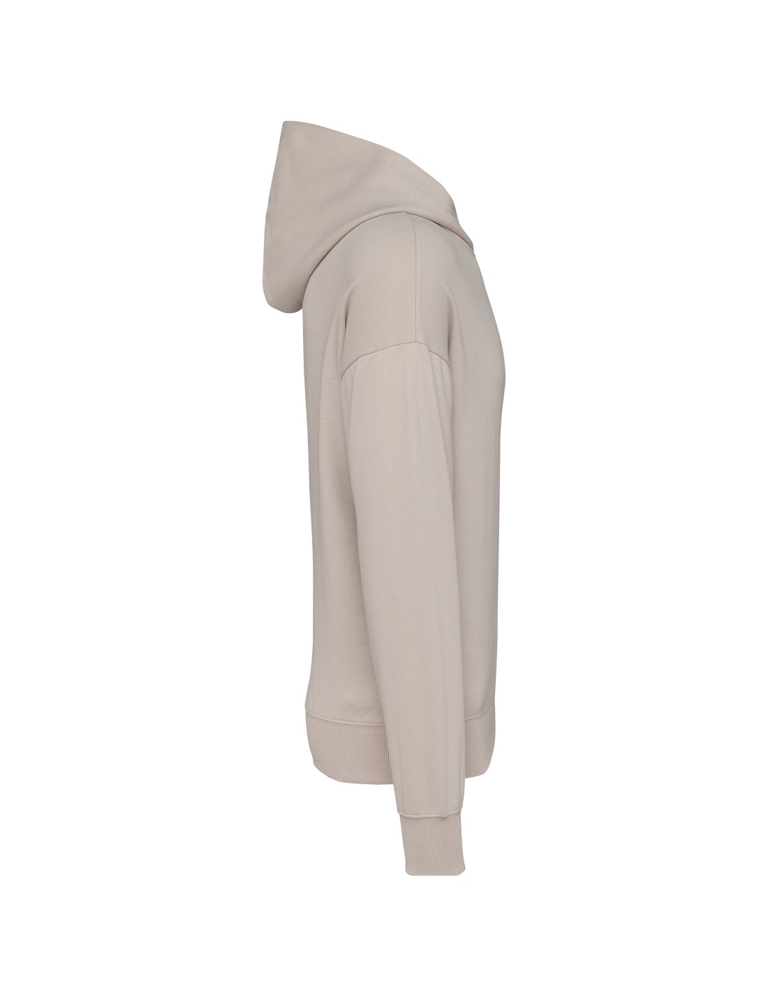 80% cotton / 20% polyester. Oversized fit with dropped shoulders. Brushed fleece. Carded cotton. 1x1 ribbing with a tubular finish on the cuffs and hem. Hidden pocket with invisible zip in the seam on the right side when worn. Cotton hood with double dart. Elastane in the ribbing on the cuffs and at the bottom of the garment to prevent them from going out of shape. Matching twill taped neck. Half-moon finish inside neck. Double overlaid overstitching on cuffs and bottom hem. No brand label on the collar, only a size tag for easy decoration.