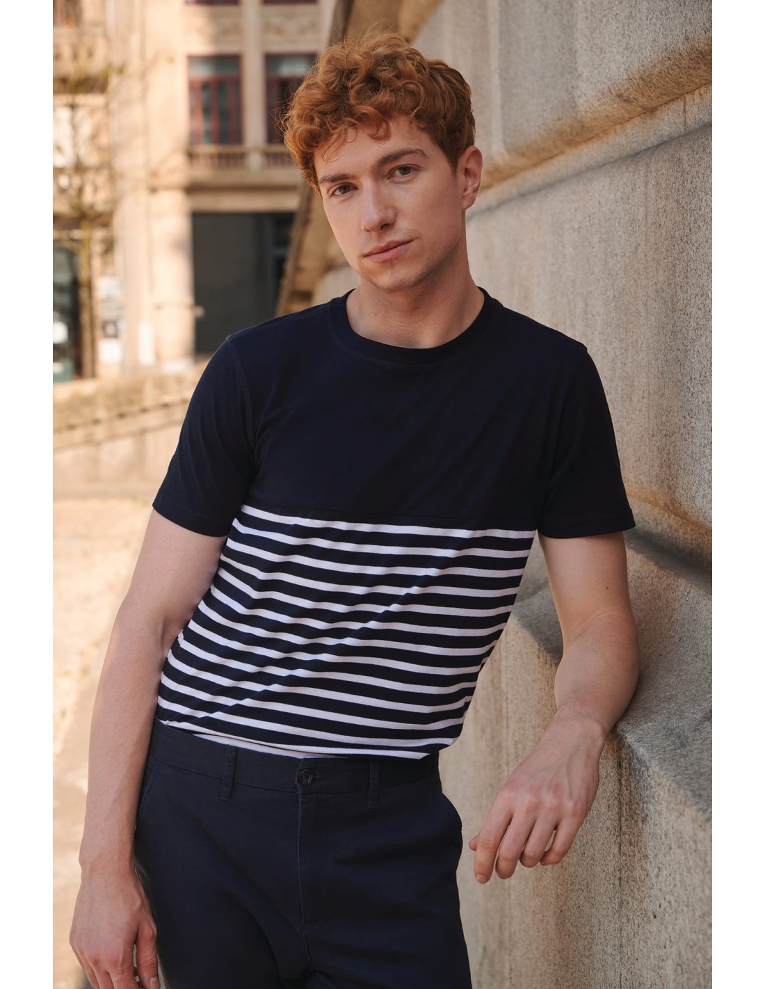 100% algodón jersey. Camiseta gruesa de manga corta, corte clásico sin etiqueta. Cuello redondo con cuello de canalé extensible. Dobladillo y costuras de las mangas en doble pespunte. Detalle de costuras planas en forma de «V» en el cuello. Costuras planas en el cuello, los hombros y la sisa. Costura en la parte superior del pecho. Parte inferior a rayas que contrasta con la parte superior del cuerpo y mangas lisas.