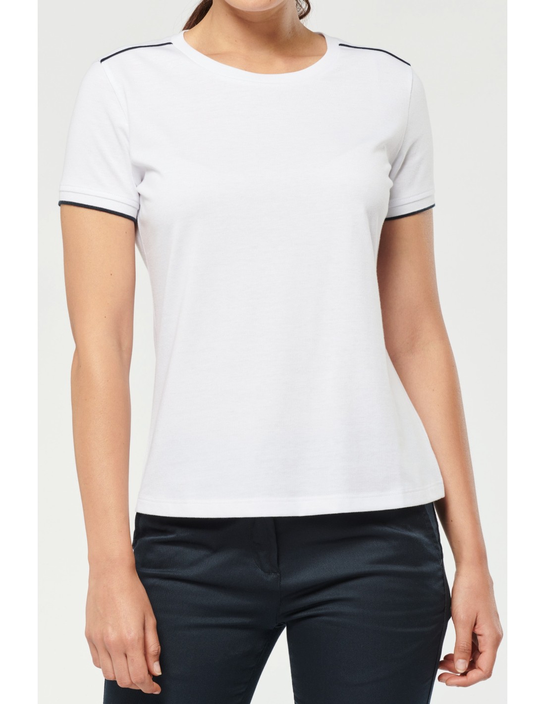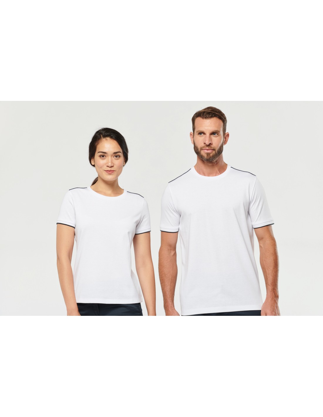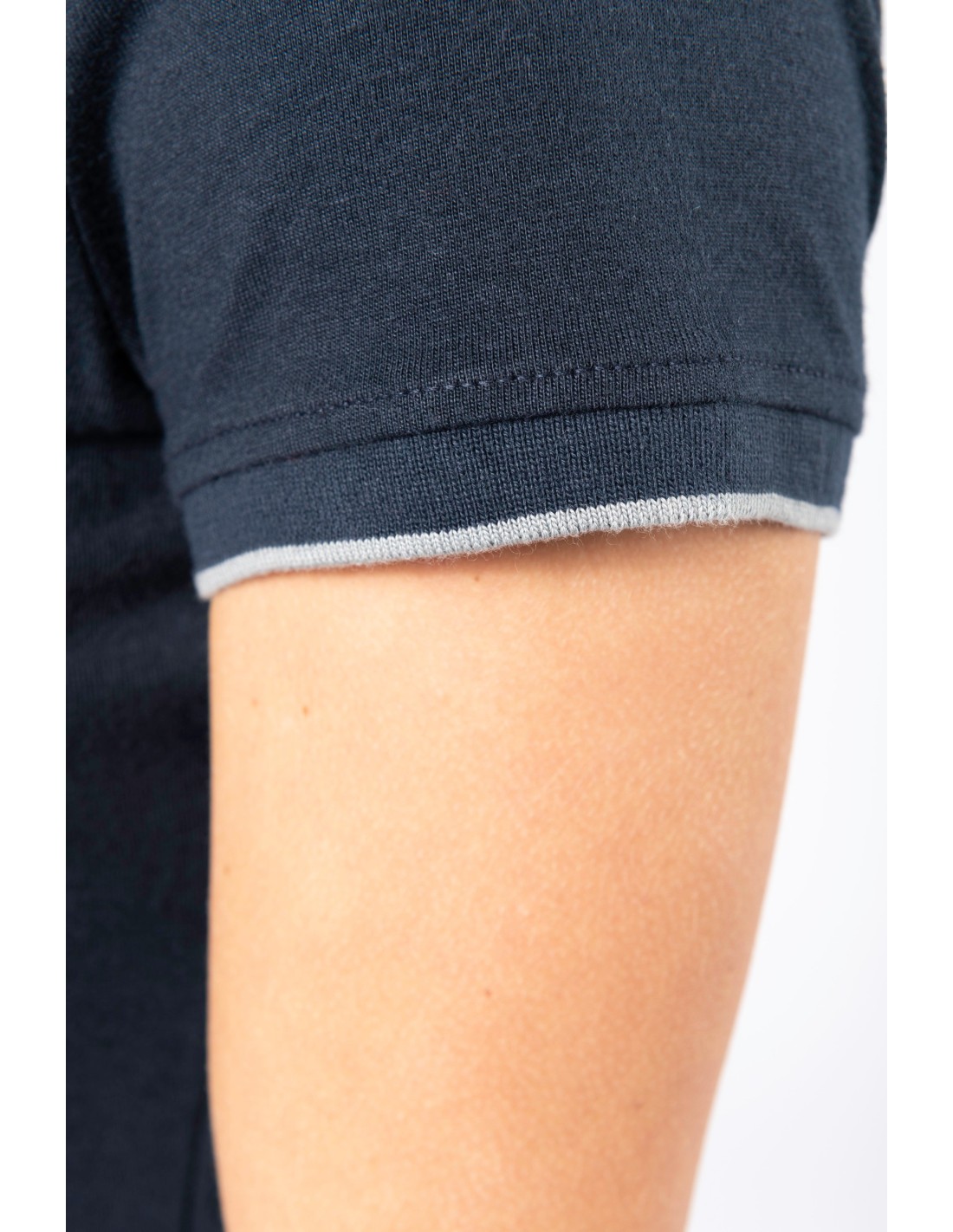 65% poliéster / 35% algodón. Algodón peinado tejido de jersey. Lavable a 60°C. Tratamiento antibolitas. Cuello redondo con elastán. Vivo contrastado en hombros e interior cuello. Acabado en canalé en el bajo de mangas con ribete contrastado. Acabado de doble pespunte en el bajo de la prenda. Ideal para el uso diario. Certificado STANDARD 100 by OEKO-TEX®N° CQ1007/7, IFTH.