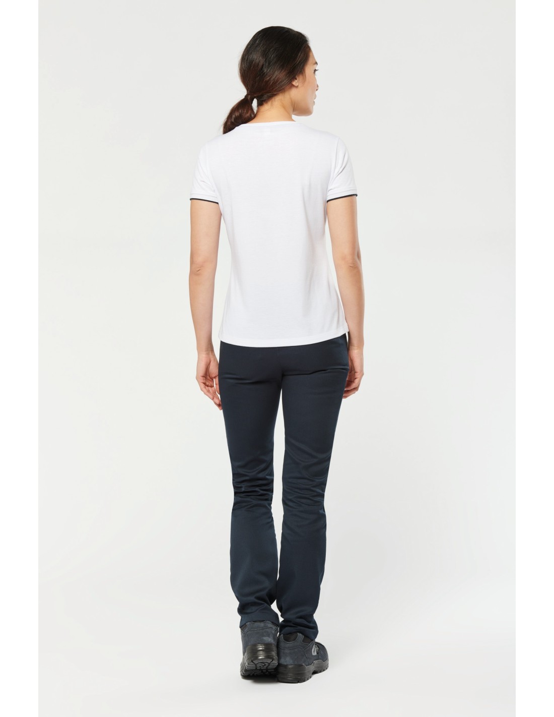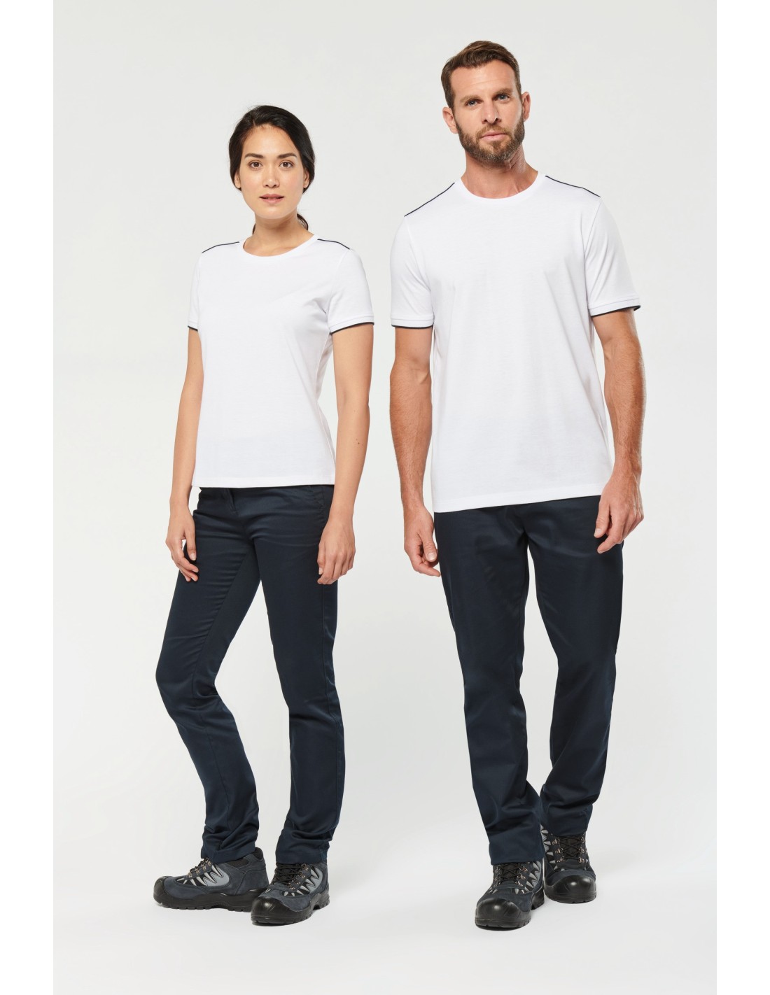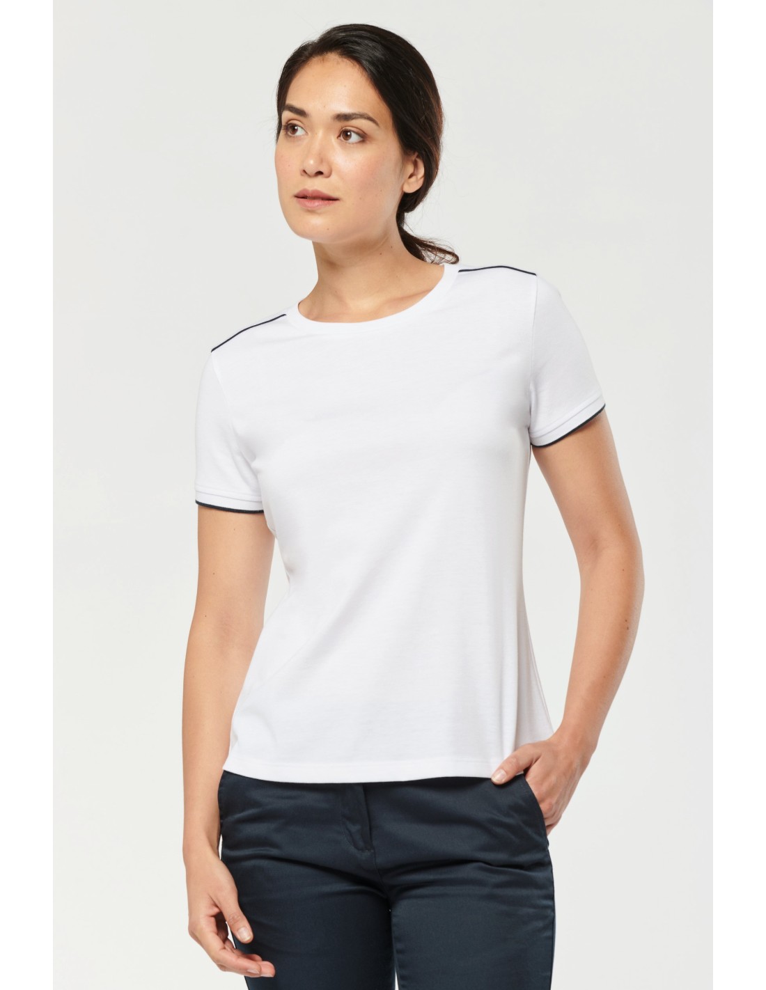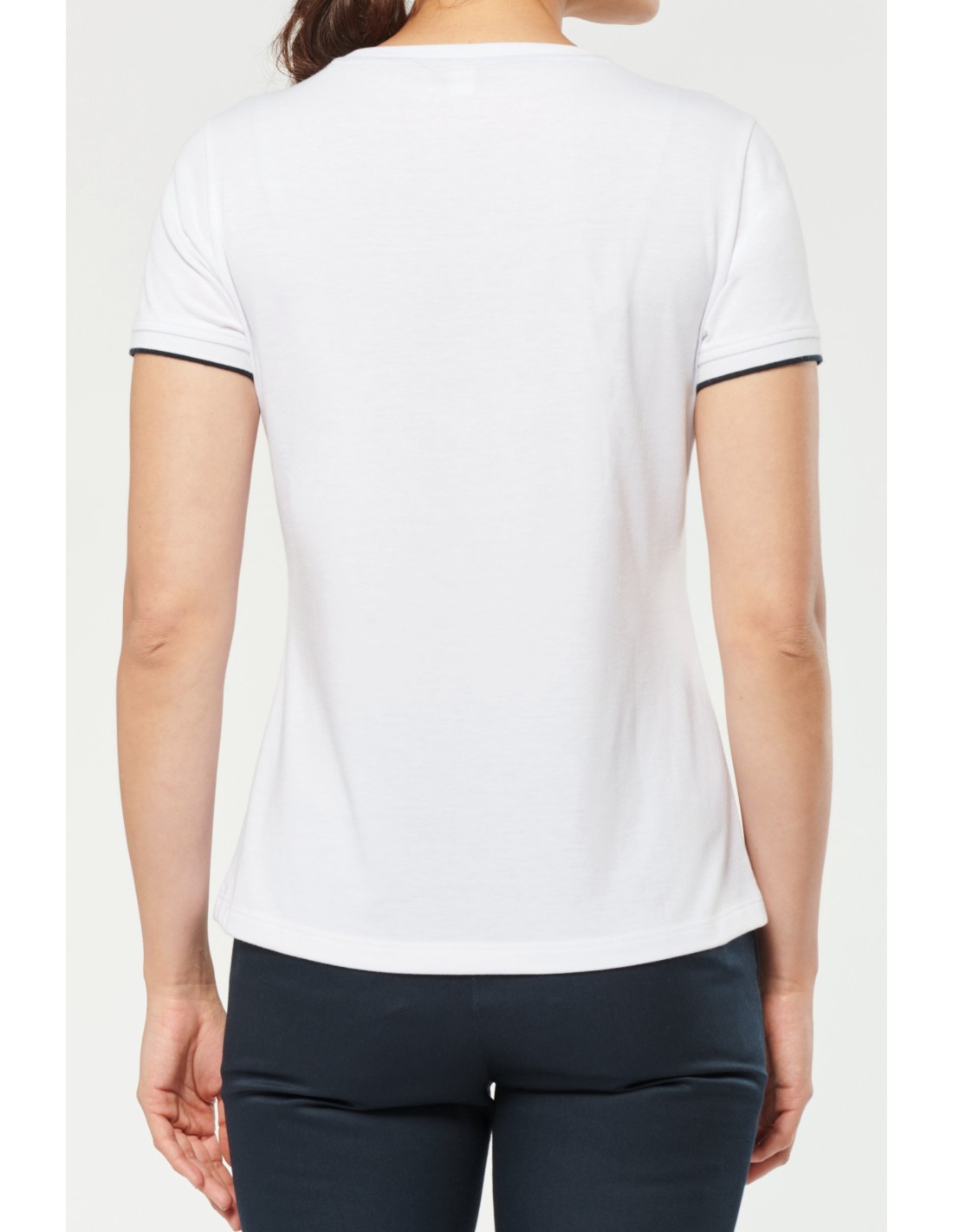65% poliéster / 35% algodón. Algodón peinado tejido de jersey. Lavable a 60°C. Tratamiento antibolitas. Cuello redondo con elastán. Vivo contrastado en hombros e interior cuello. Acabado en canalé en el bajo de mangas con ribete contrastado. Acabado de doble pespunte en el bajo de la prenda. Ideal para el uso diario. Certificado STANDARD 100 by OEKO-TEX®N° CQ1007/7, IFTH.
