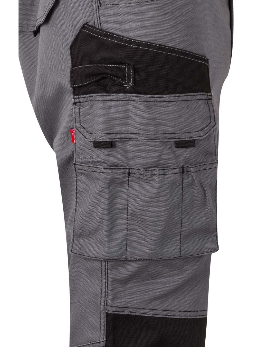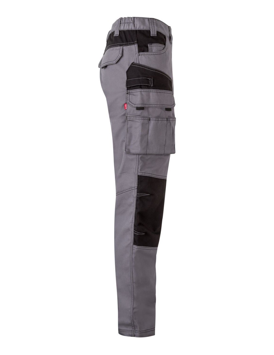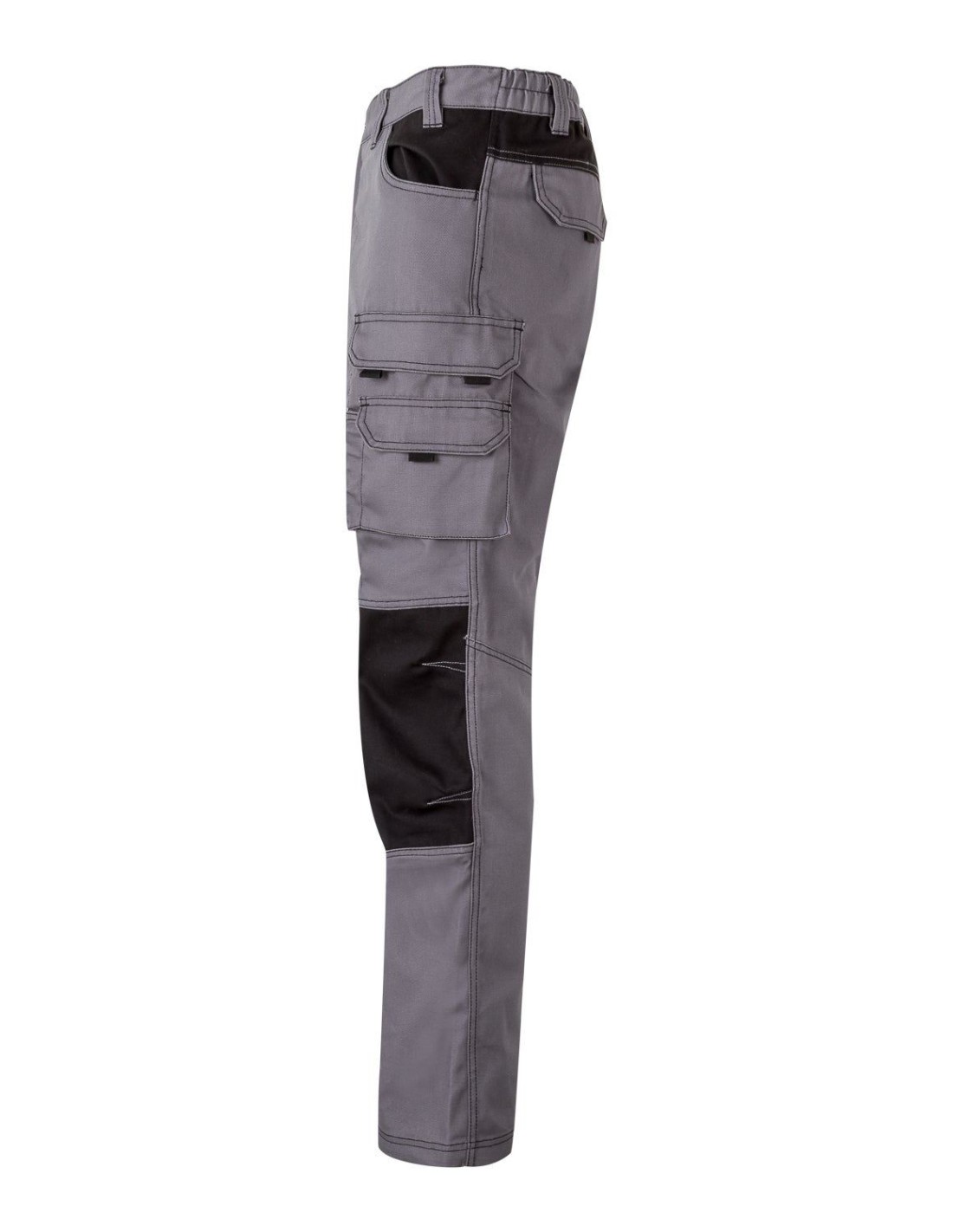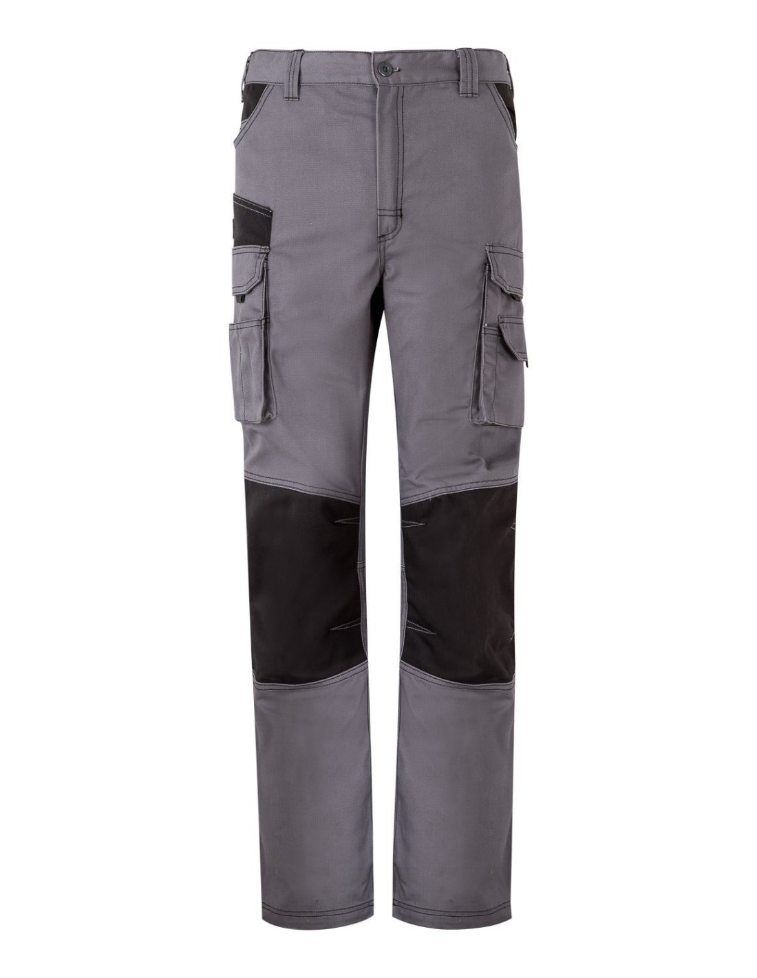 Pantalón de trabajo multibolsillos bicolor con refuerzos. Diez bolsillos distribuidos en pierna lateral, delanteros y traseros con diferentes tamaños para la colocación de herramientas y utensilios, dos bolsillos traseros con cierre de tapeta y velcro. Cierre central con cremallera y botón. Refuerzo de tejido trasero y cinturilla elástica para más elasticidad de movimientos. Refuerzo de tejido en rodillas antidesgaste. Trabillas más anchas para la colocación de diferentes tamaños de cinturón y doble costura de seguridad. Fabricado en tejido canvas, más cómodo y resistente. Composición 65% Poliéster - 35% Algodón. Gramaje 290 gr/m2.