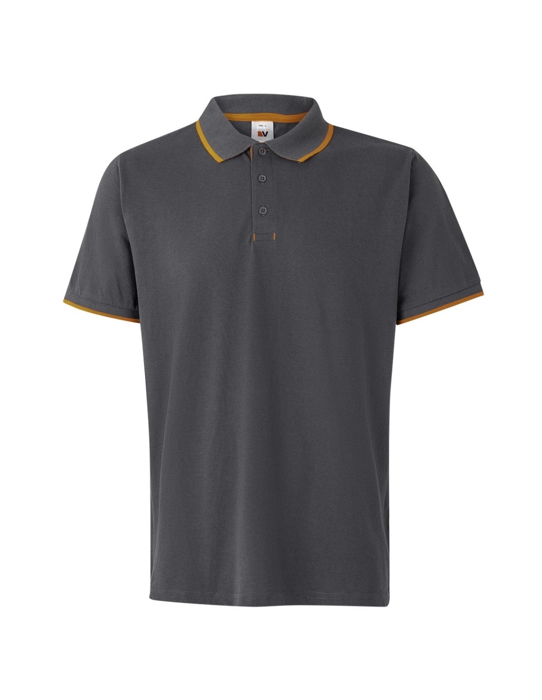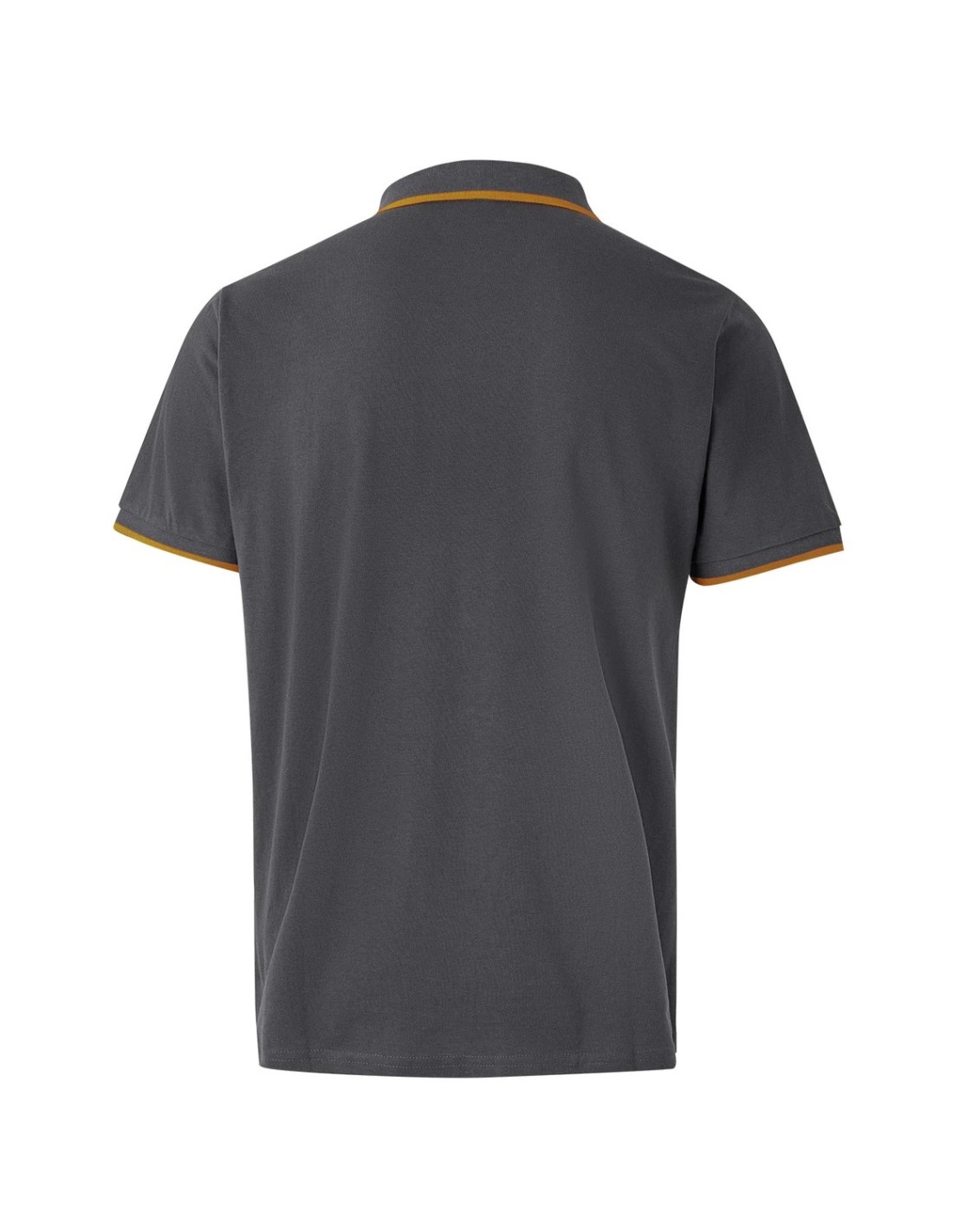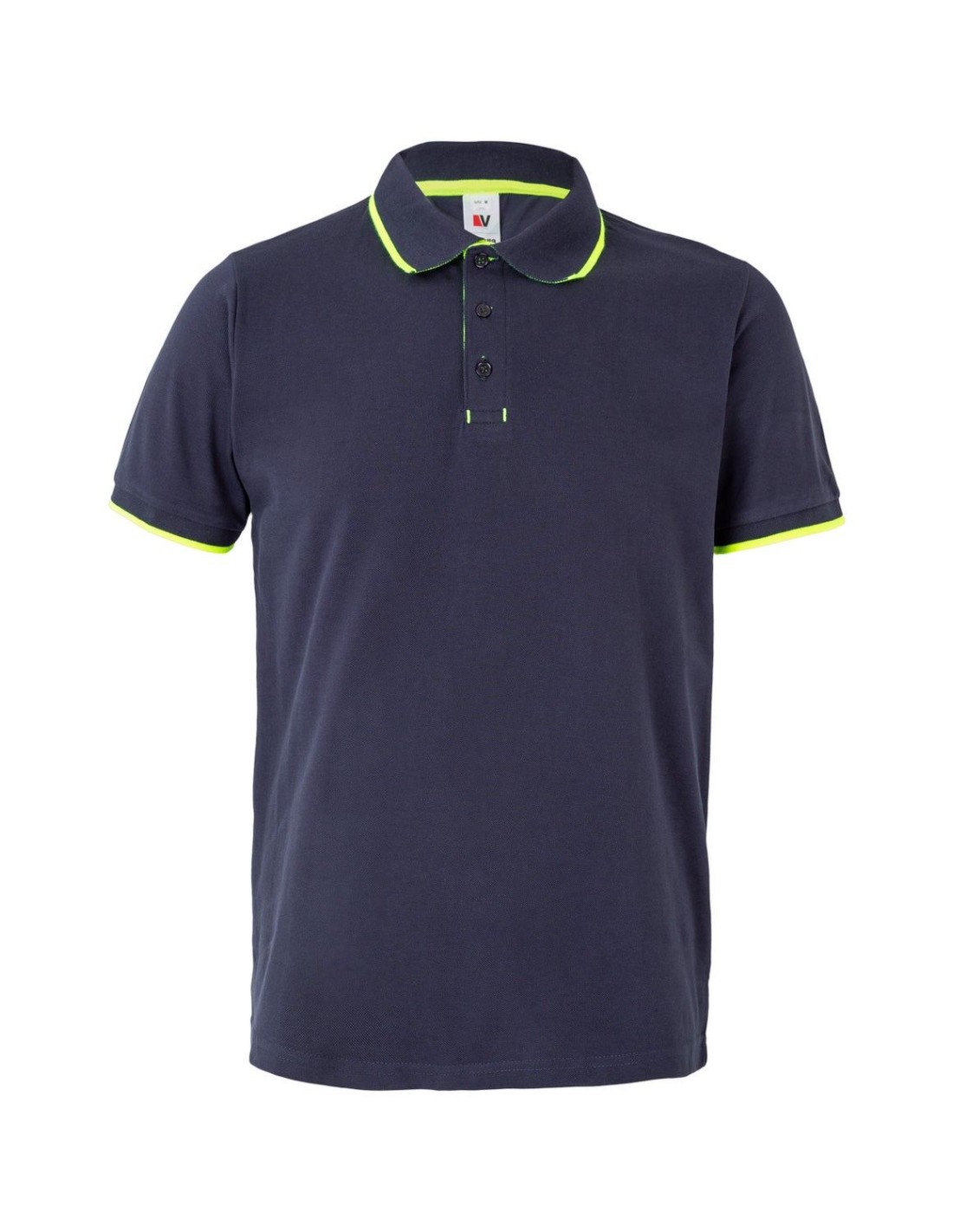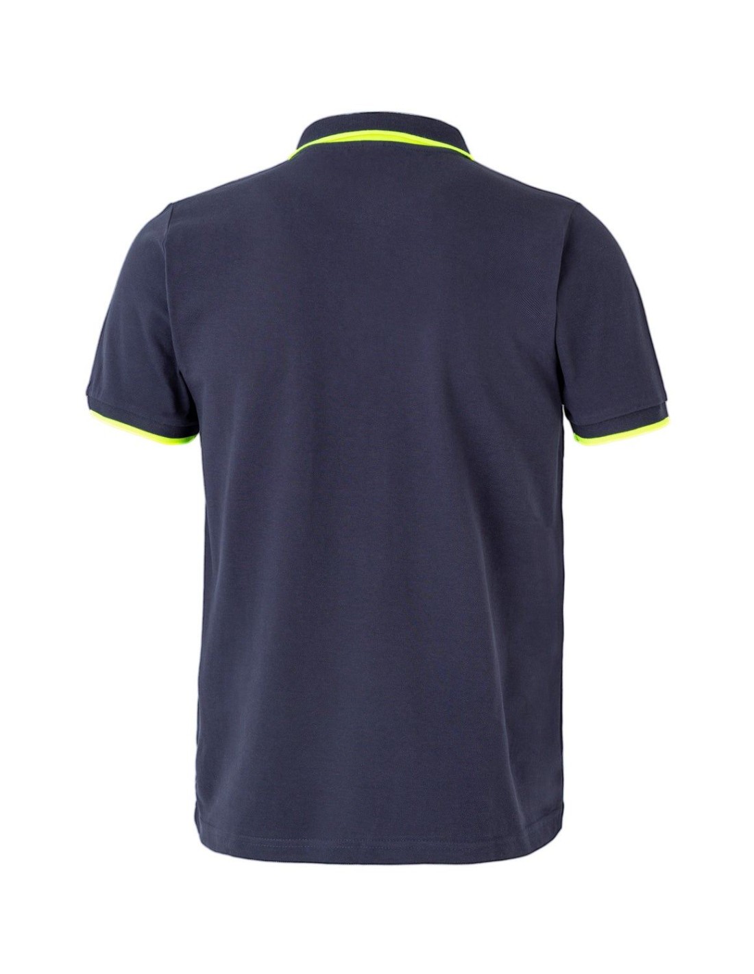 Polo de trabajo bicolor raya manga corta con cierre central con botones. Cuello y bajo de la managa de canalé. Incluye bolsillo de parche suelto, sin coser. Color contraste en el interior del cuello, línea en el bajo de la manga, interior de la botonadura, cinta de tejido que cubre la costura del cuella y presillas.