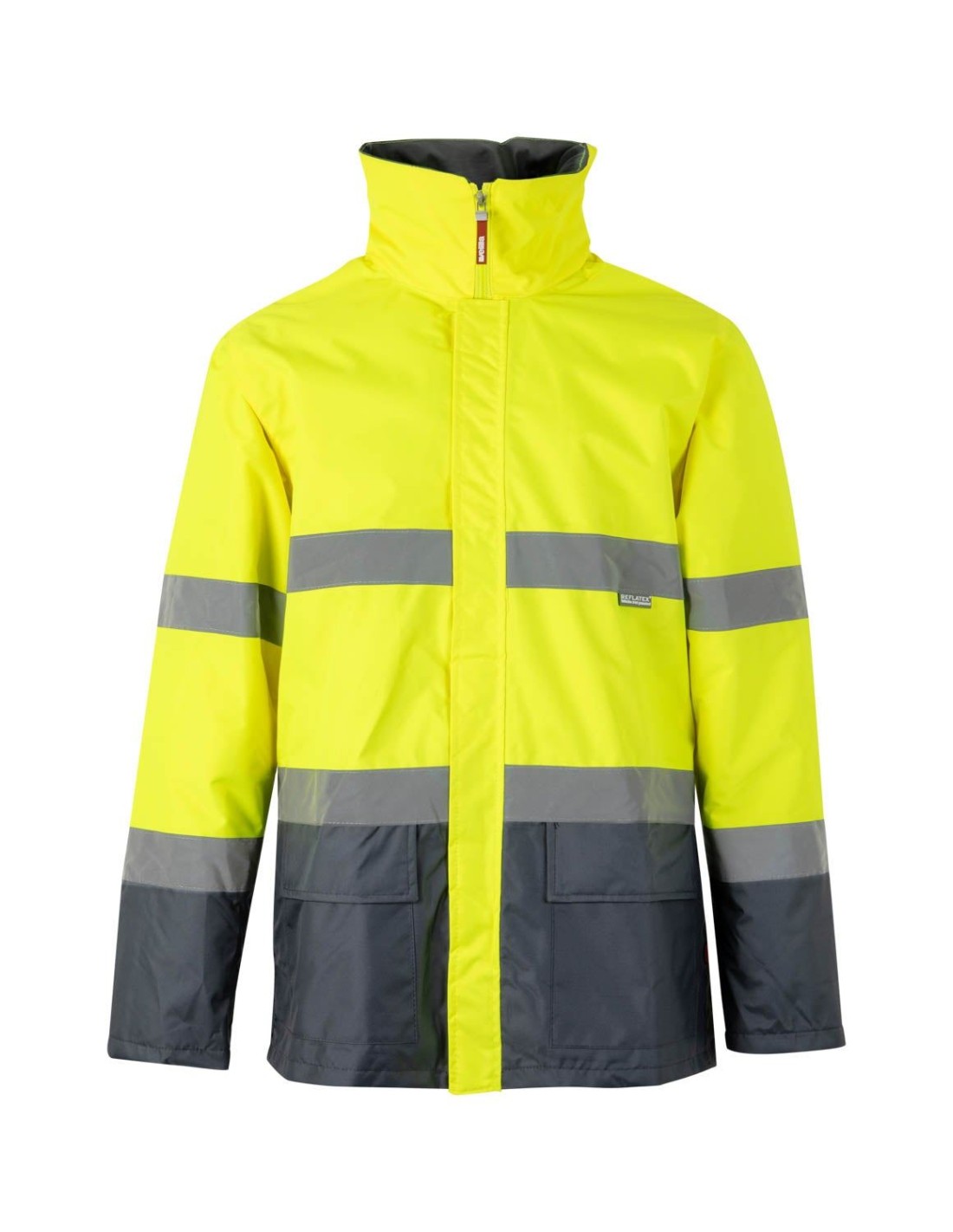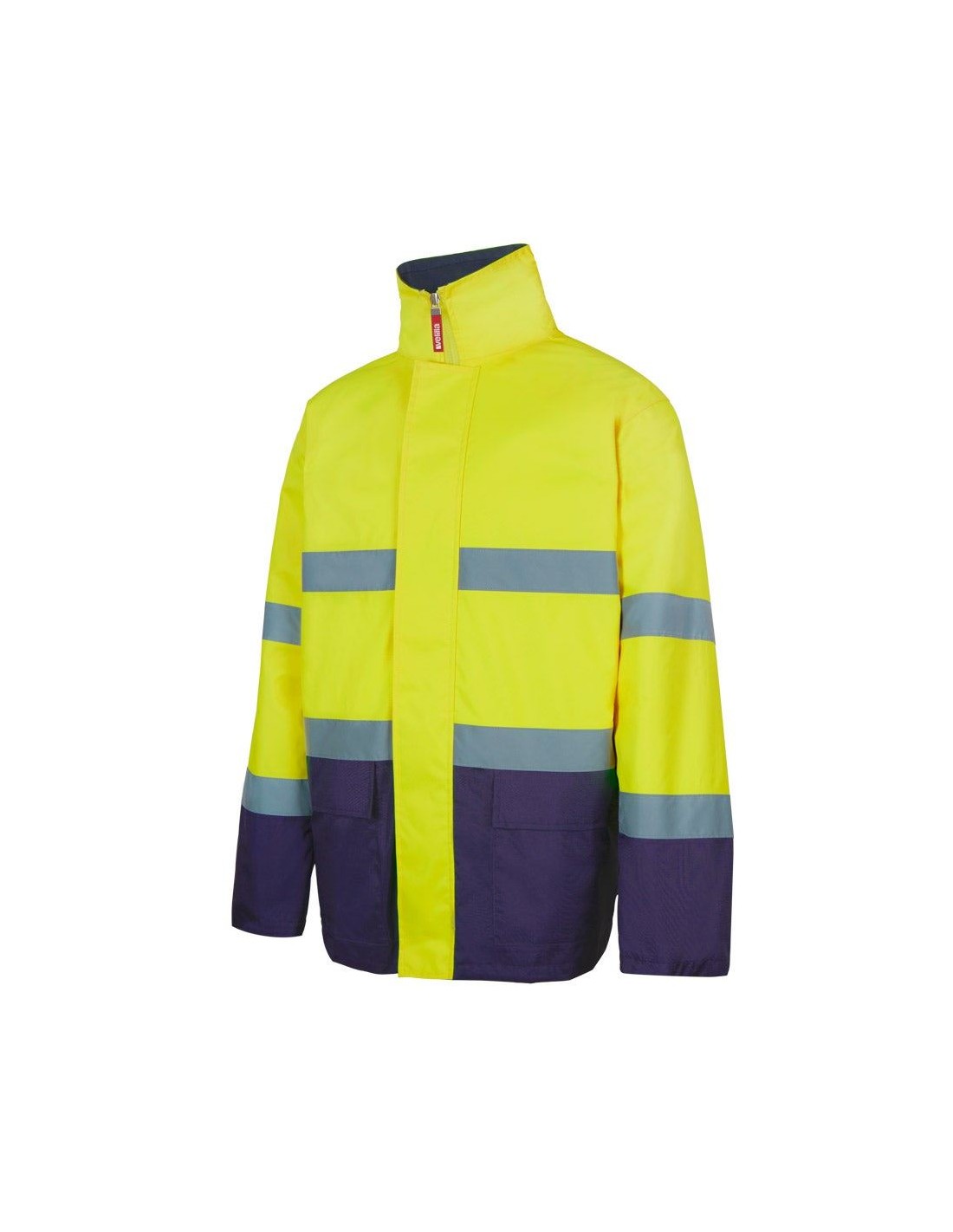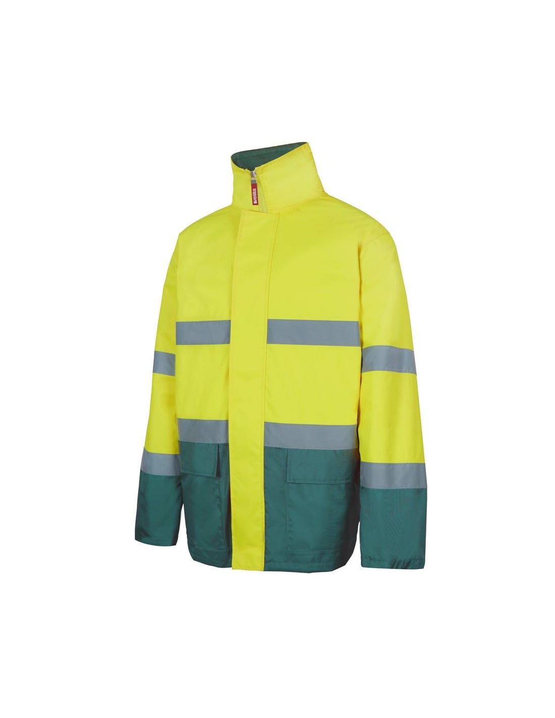Parka bicolor de alta visibilidad con cintas reflectantes en torso y mangas. Cremallera central oculta con tapeta, botones automáticos, puño interior de canalé, varios bolsillos y capucha desmontable en el interior del cuello.