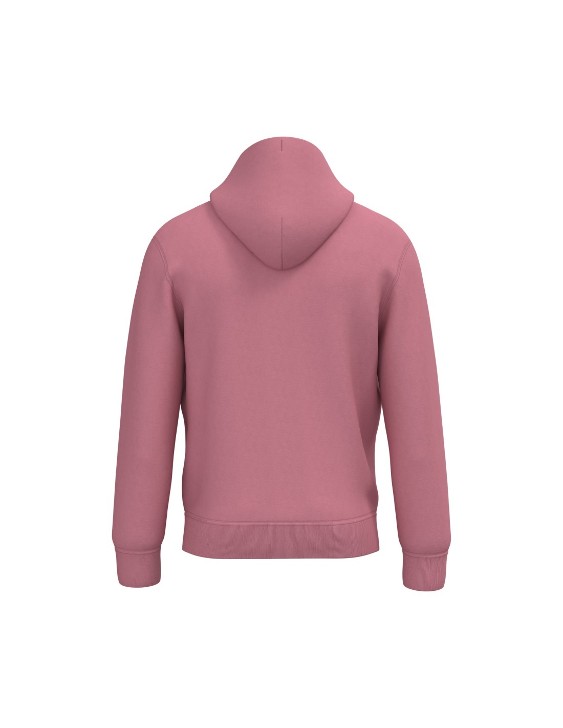 85 % algodón orgánico / 15 % poliéster reciclado post-consumer. Algodón peinado Ringspun. Corte recto. Lavado con enzimas. Felpa perchada de 3 hilos LSF (Low Shrinkage Fleece, felpa preencogida). Media luna en la espalda. Bolsillo tipo canguro. Canalé 1 x 1 en el bajo de la prenda y el bajo de las mangas. Doble pespunte en el bajo de las mangas, sisas, bajo de la prenda y media luna. Tira cubrecosturas en la parte interior del cuello. Capucha forrada en el material principal con tope de cordón. Cordón redondo con puntas y ojales de metal reciclado. El color Raw Natural se distingue por su aspecto bruto, visualmente texturizado, con partículas finas visibles a simple vista.