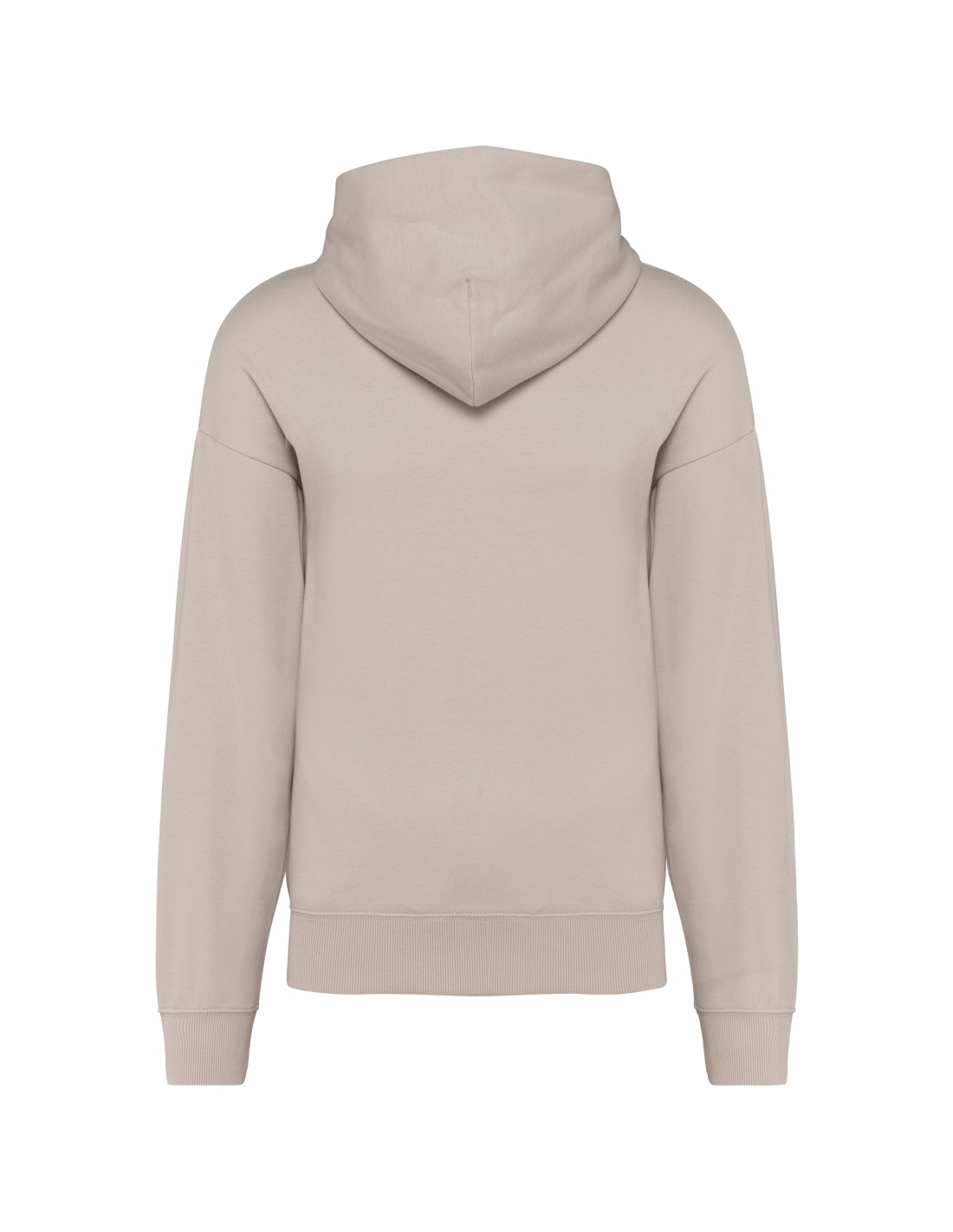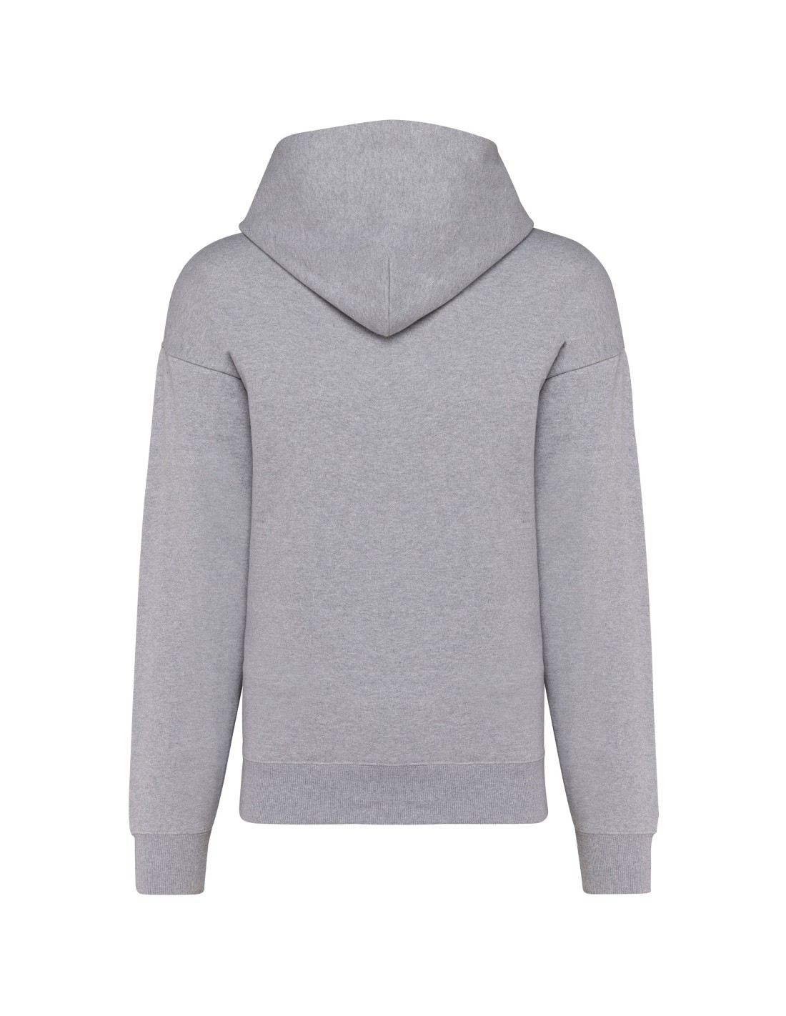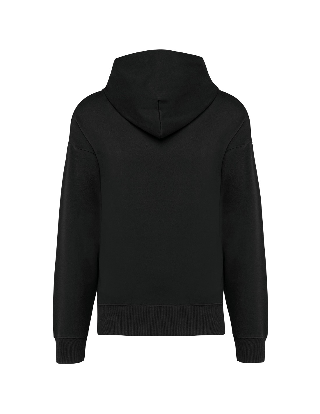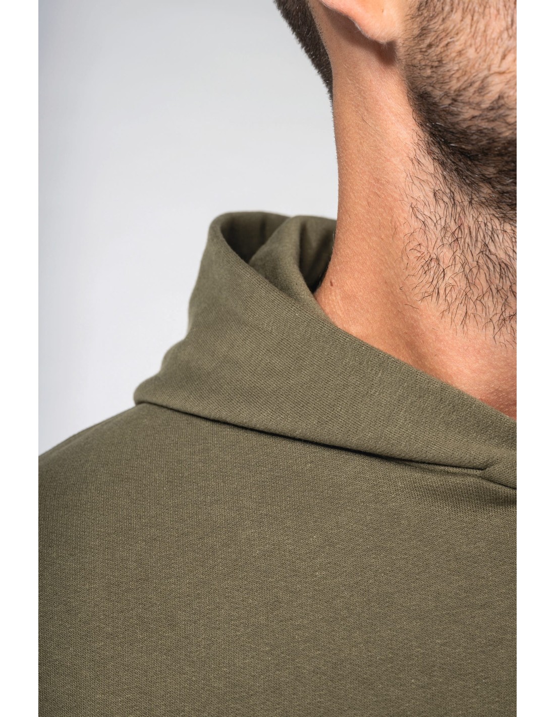 80% algodón / 20% poliéster. Corte oversize con hombros caídos. Felpa perchada. Algodón cardado. Canalé 2x1 con acabado tubular en los puños y el bajo de la prenda. Bolsillo oculto con cremallera invisible en la parte derecha de la costura cuando se lleva. Capucha forrada de algodón. Elastano en el bajo de la manga y de la prenda para evitar que se deforme. Tira cubrecosturas de espiga a tono. Acabado de media luna en la parte interior del cuello. Doble pespunte en el bajo de las mangas y de la prenda. Sin etiqueta de marca en el cuello, únicamente una etiqueta con la talla para facilitar la personalización.
