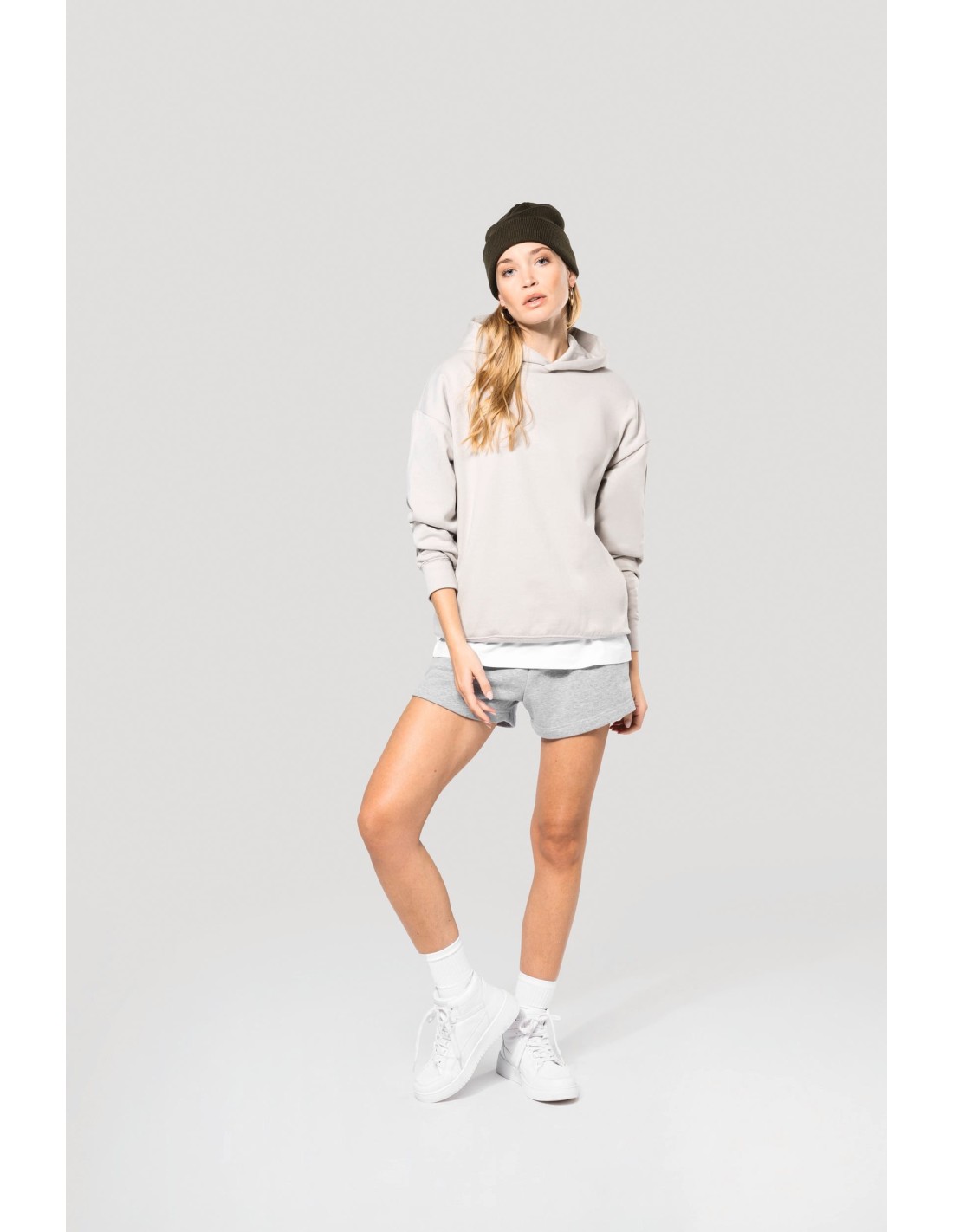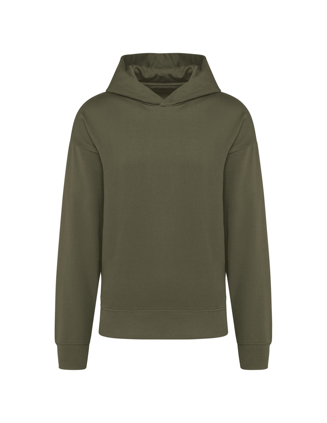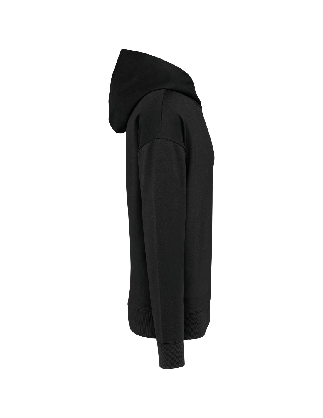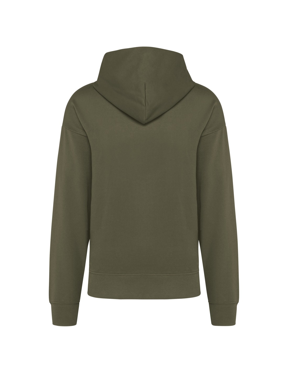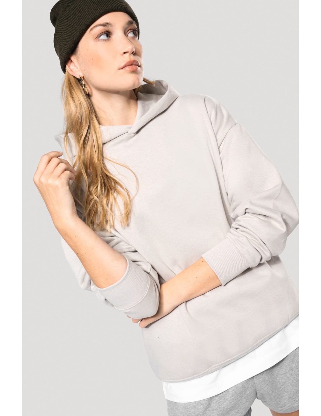 80% algodón / 20% poliéster. Corte oversize con hombros caídos. Felpa perchada. Algodón cardado. Canalé 2x1 con acabado tubular en los puños y el bajo de la prenda. Bolsillo oculto con cremallera invisible en la parte derecha de la costura cuando se lleva. Capucha forrada de algodón. Elastano en el bajo de la manga y de la prenda para evitar que se deforme. Tira cubrecosturas de espiga a tono. Acabado de media luna en la parte interior del cuello. Doble pespunte en el bajo de las mangas y de la prenda. Sin etiqueta de marca en el cuello, únicamente una etiqueta con la talla para facilitar la personalización.