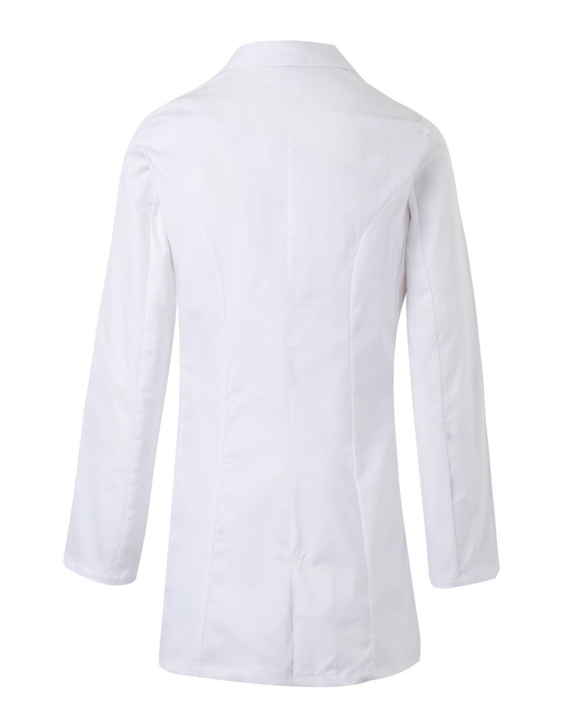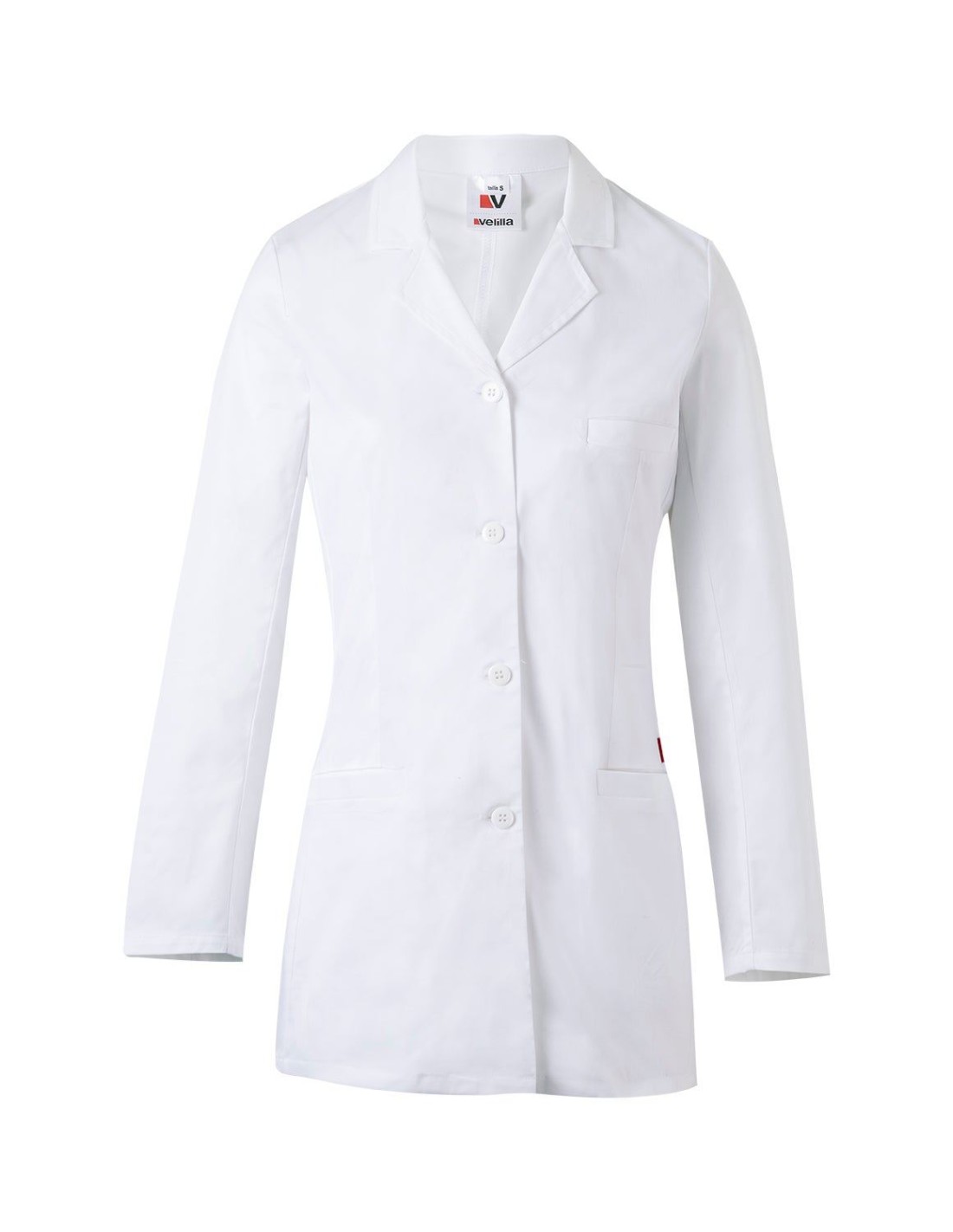 Bata corta de laboratorio para mujer, con cierre central de botones Manga tipo sastre, de dos piezas, con abertura en la espalda semientallada. Costadillos frontales y dobles traseros. Pinzas con costura de seguridad en la espalda Dispone de tres bolsillos: uno en la parte superior izquierda de la bata y dos bolsillos inferiores Fabricada en: Stretch. 62% poliéster - 34% algodón - 4% elastano / 185 g/m2