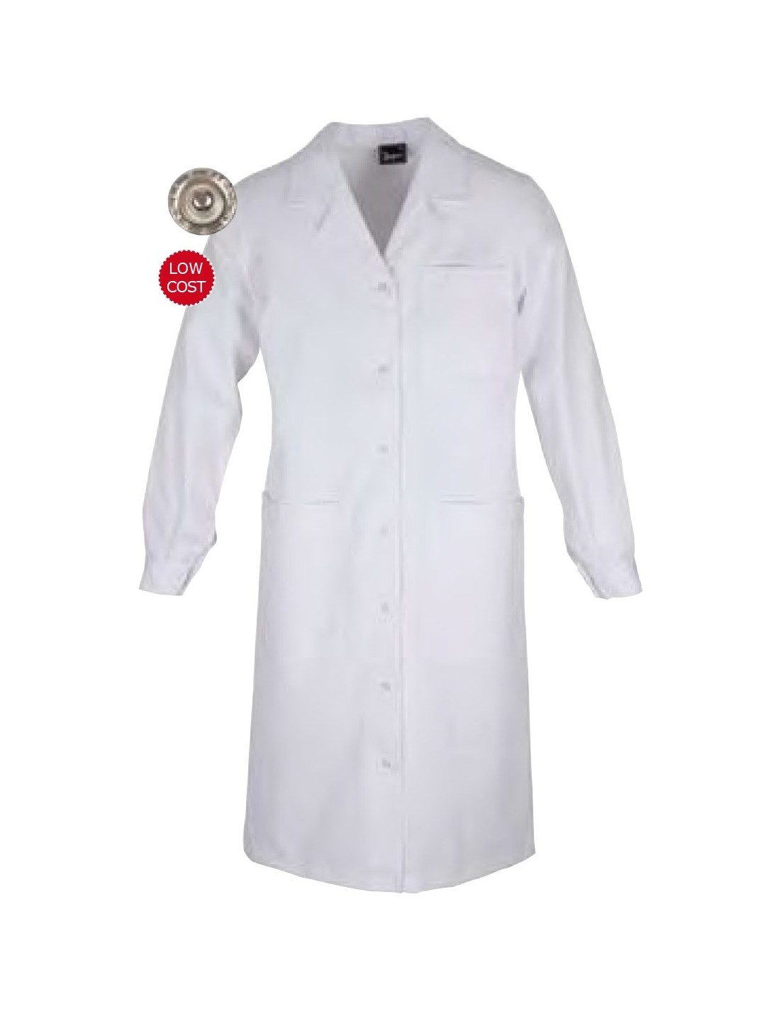Bata de mujer blanca sanitaria de trabajo de manga larga con puño cerrado con corchetes. Presiones níquel. Dos Bolsillos laterales en la parte inferior y un bolsillo en la parte superior, cuello solapa. Fabricada en 67% Poliéster - 33% Algodón. Sarga 210g/m2.